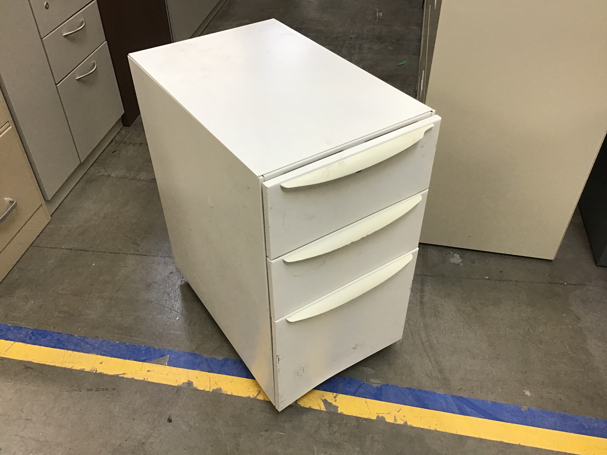 23x15x27” White metal 3 drawer storage and file cabinet on castors - wear throughout 11/21/25