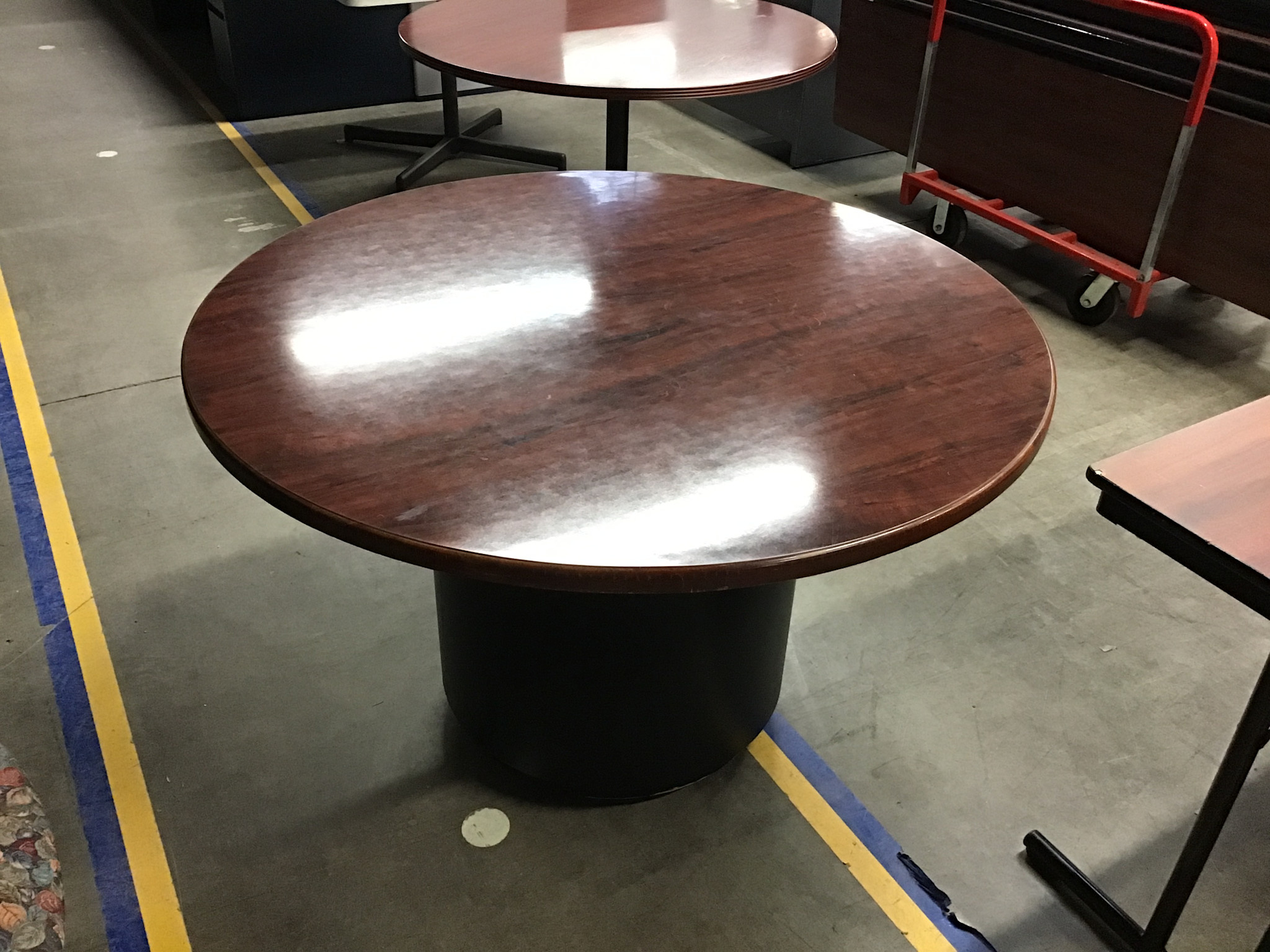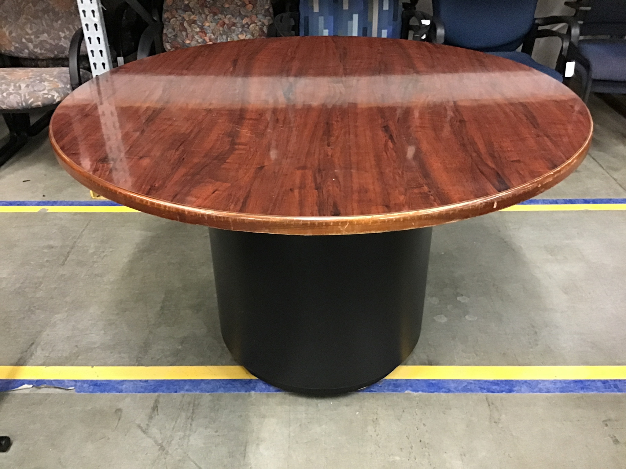 48” Cherry color round table large pedestal on castors - some wear 3/5/26