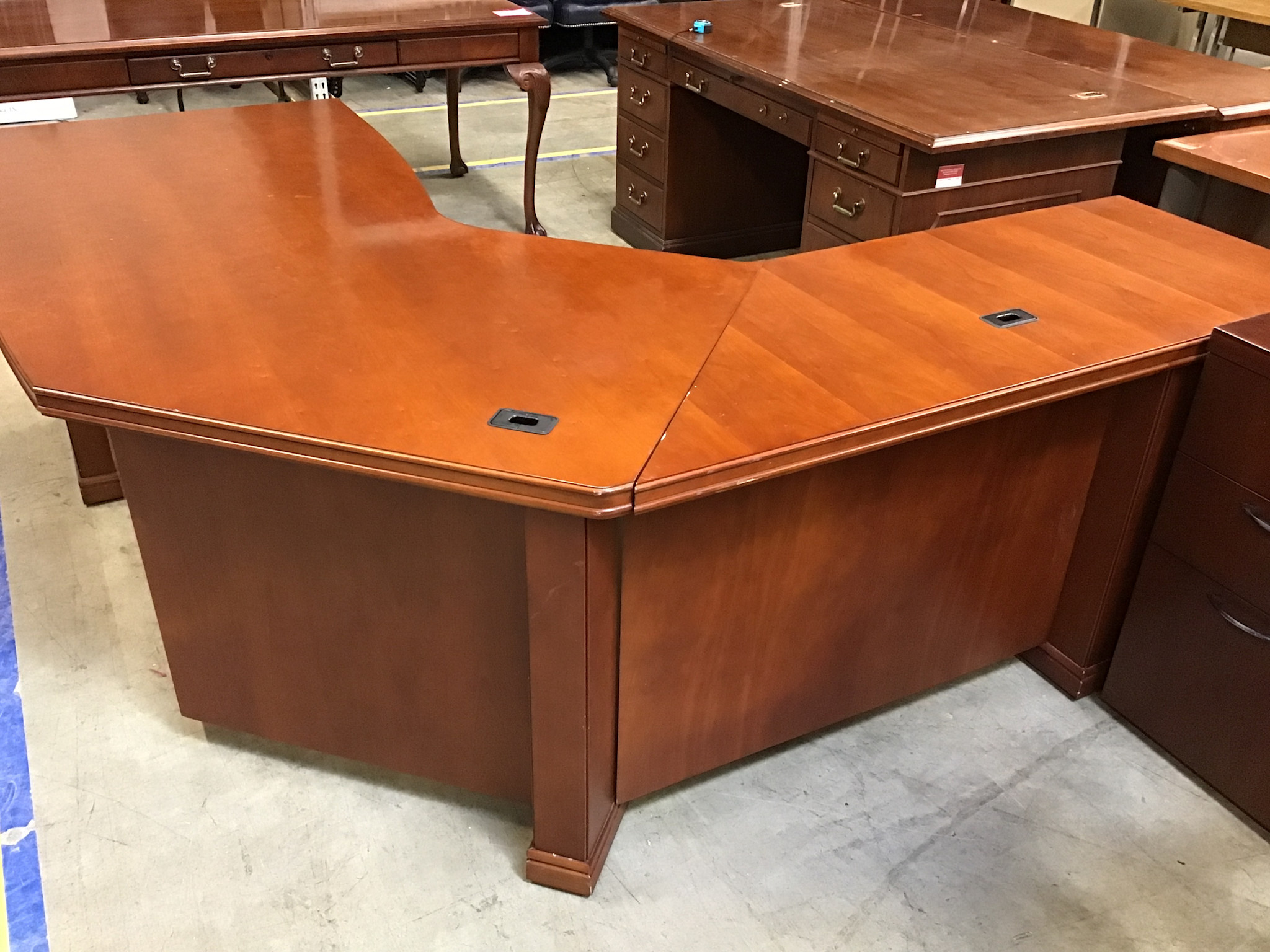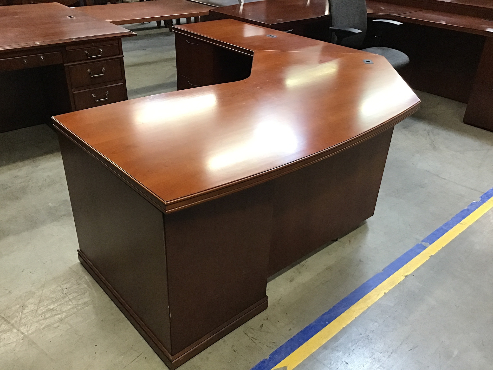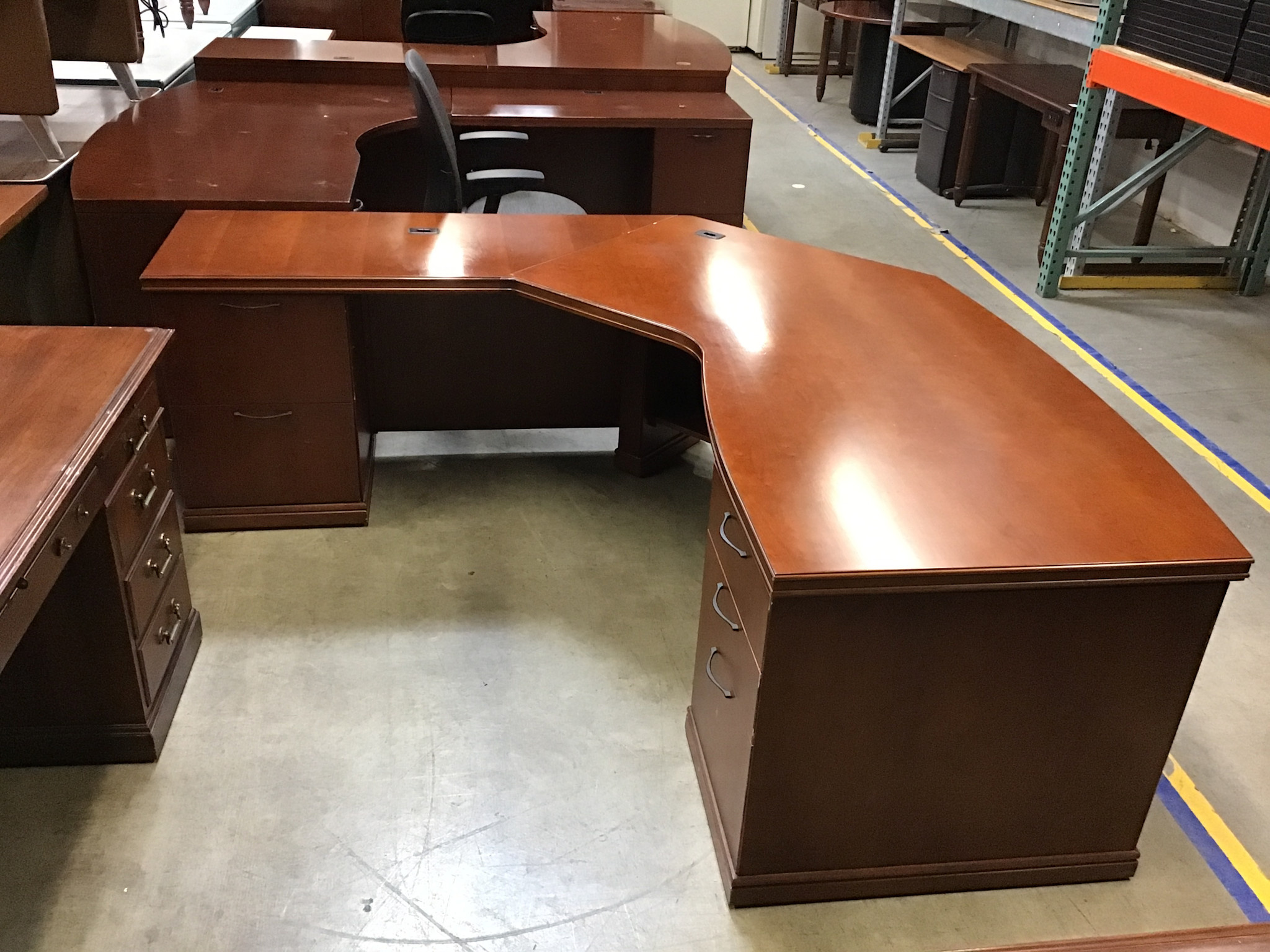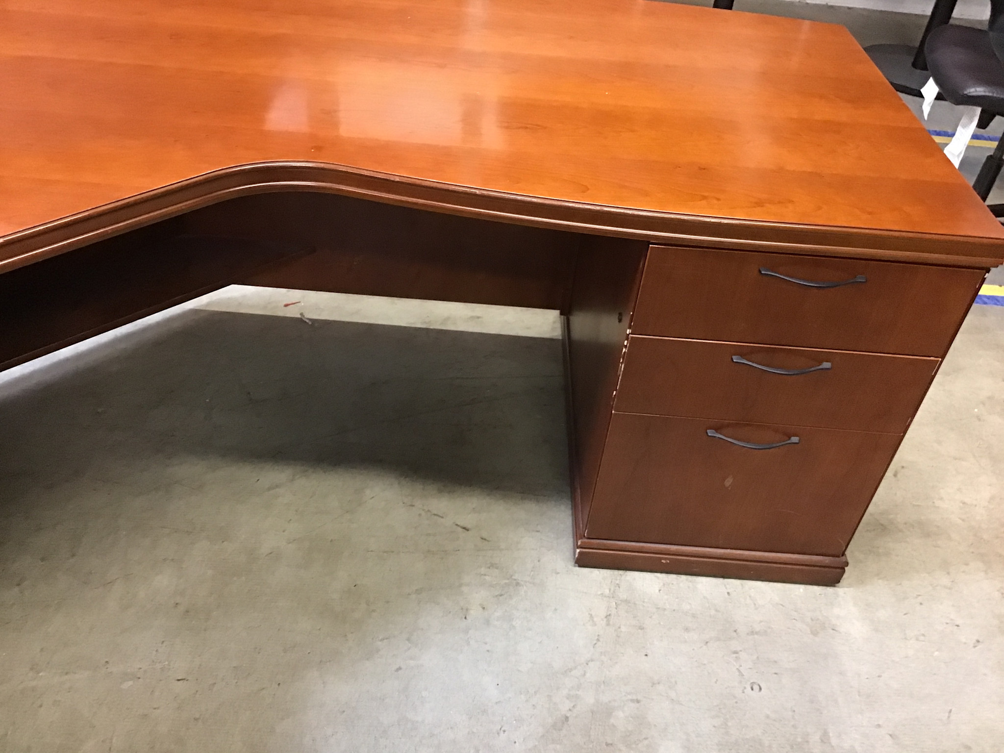 78x80” Curved L shaped light cherry color desk. 33” deep 29” tall. 5 drawers left return - some scuffs 11/7/25