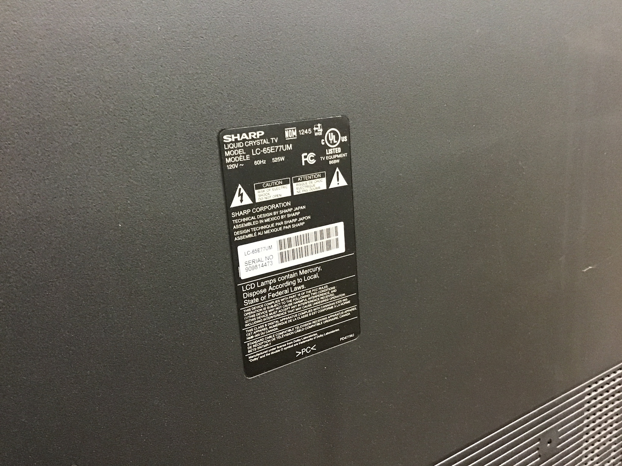 Sharp 65” LC-65E77UM LCD Television with HDMI - scratch on screen 11/24/25