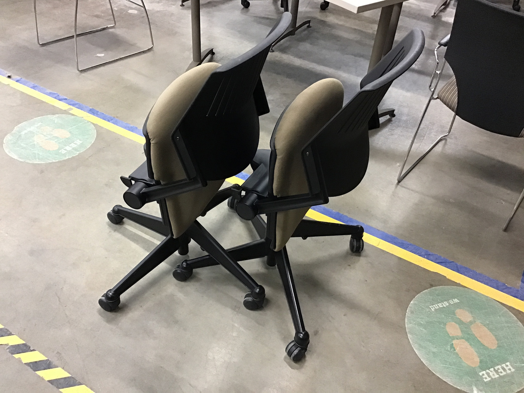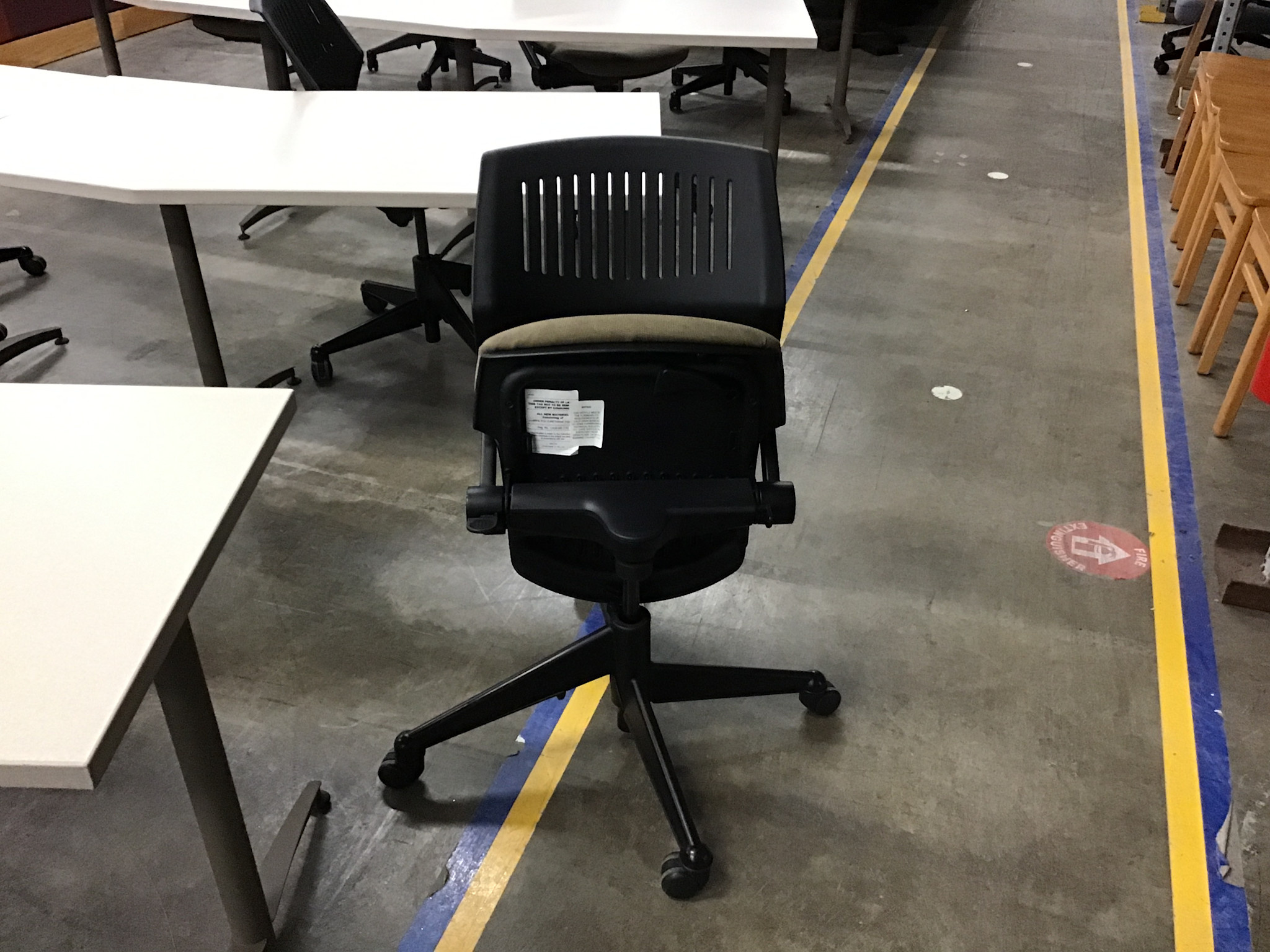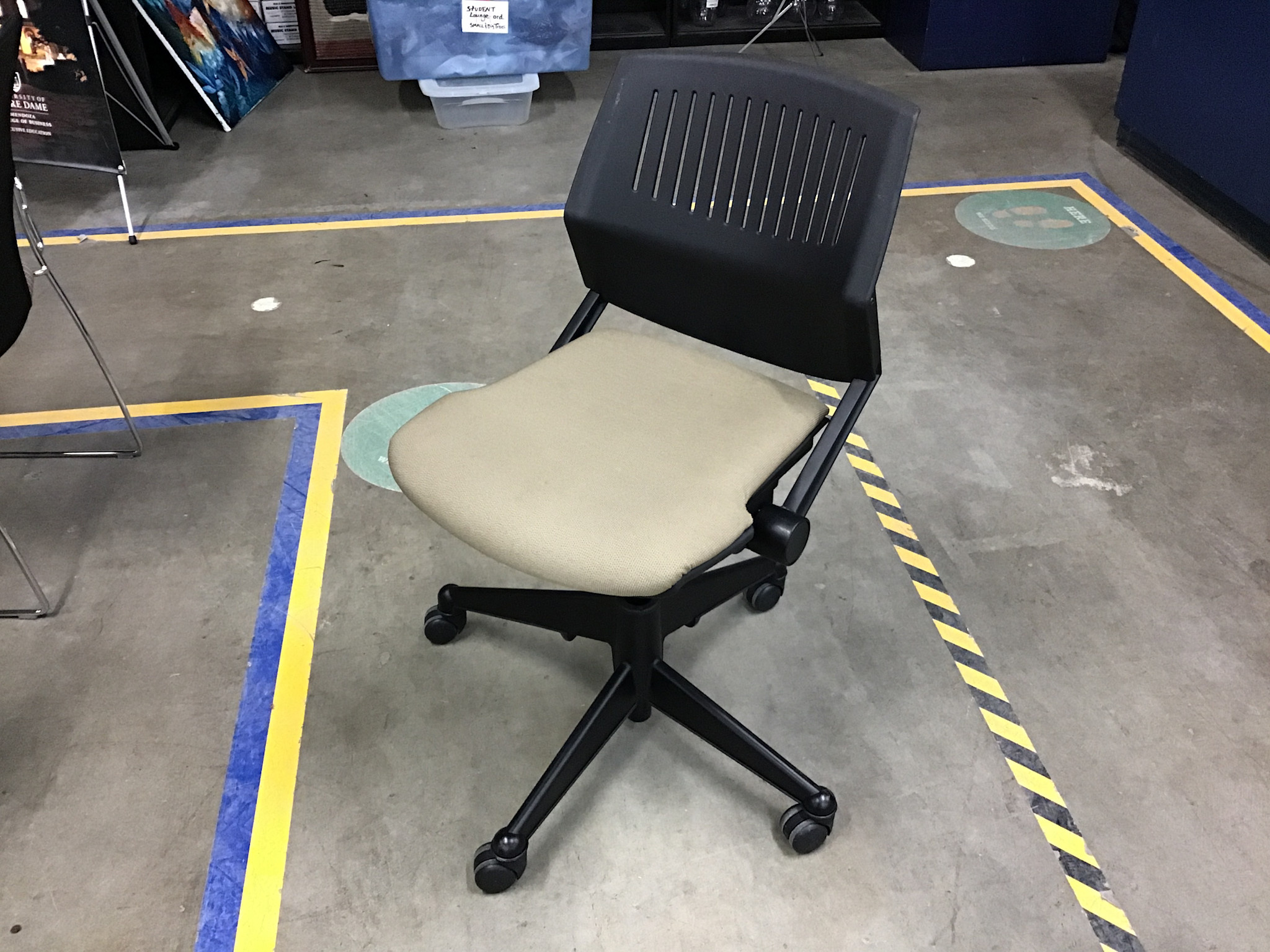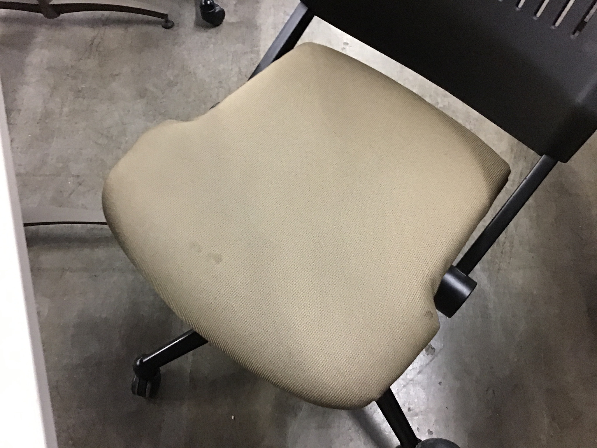 Tan cushioned seat black plastic back height adjustable folding seat desk chair - light stains. Interlocks with matching chairs 11/18/25