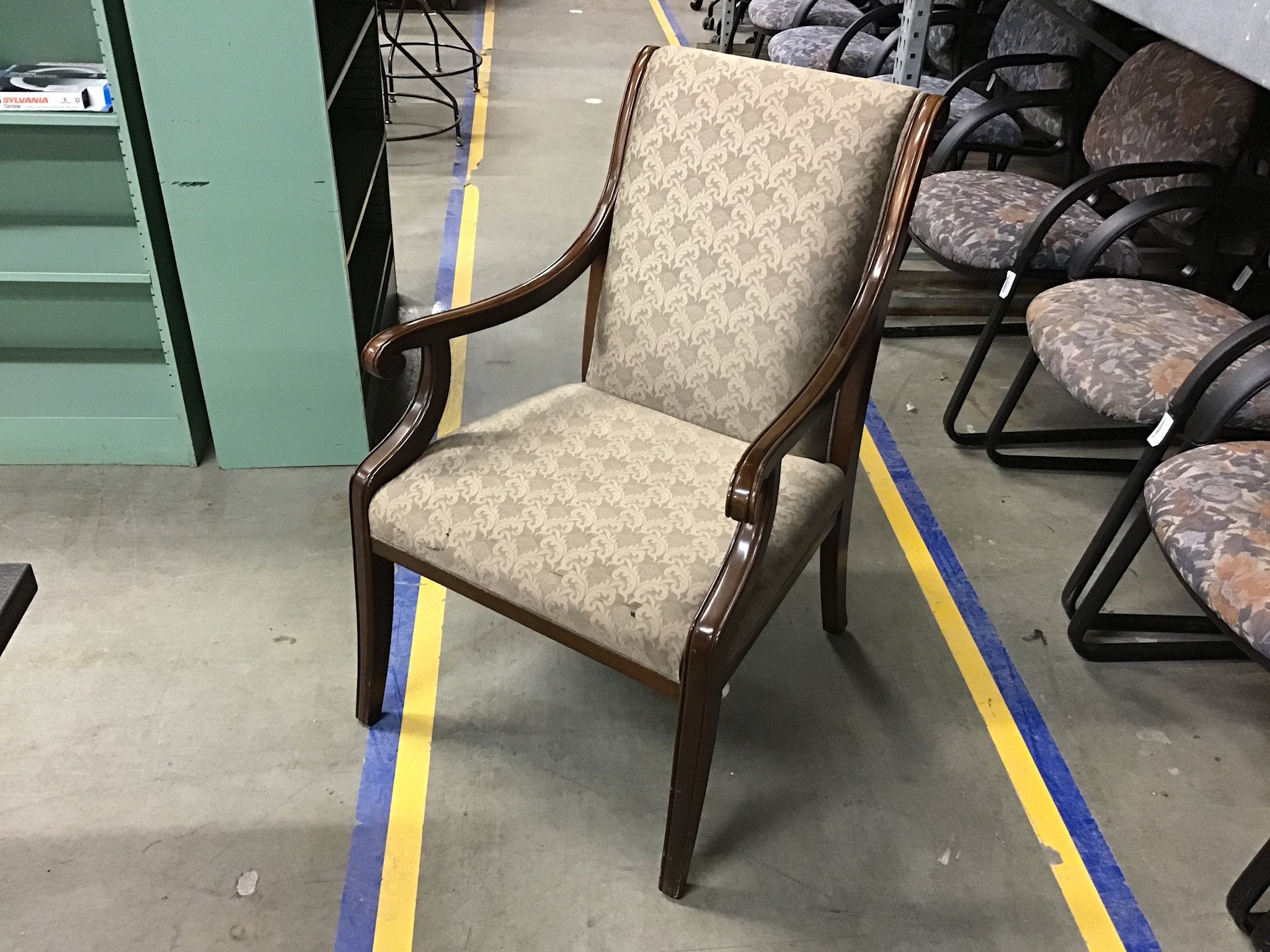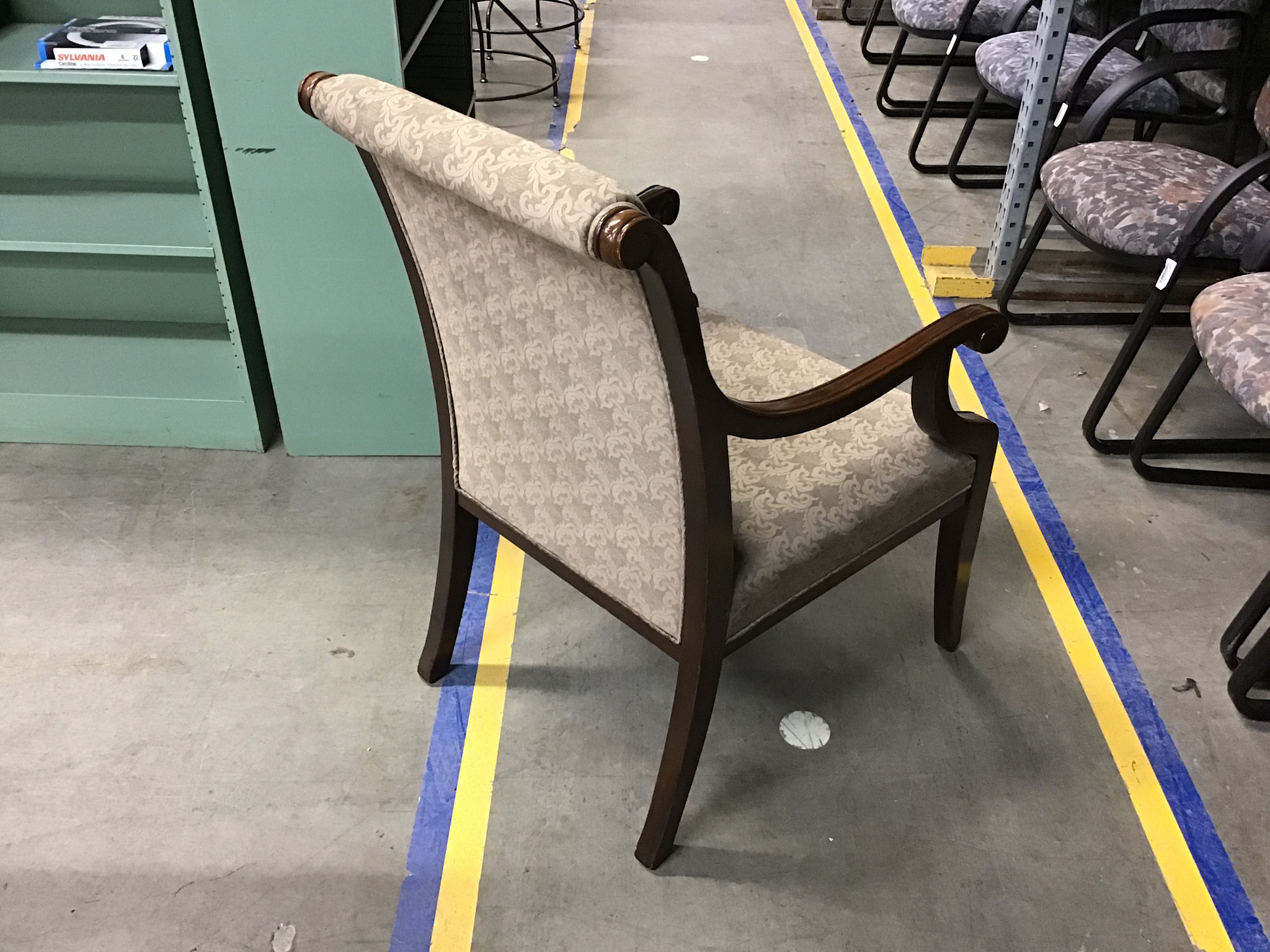 Wood frame tan pattern cushioned chair - some stains 1/14/26